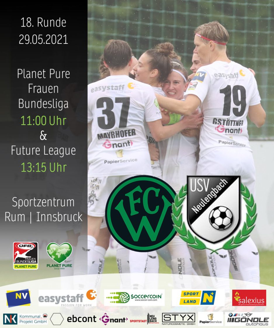Zum Abschluss der Saison treffen unsere Frauen Bundesliga Mannschaft und unser Future League Team am 29.05.2021 auswärts auf die Damen des FC Wacker Innsbruck. Die Innsbruckerinnen konnten den Verbleib in der Planet Pure Frauen Bundesliga bereits fixieren und auch für unsere Mädels kann sich an der Tabellensituation in der Bundesliga im letzten Spiel nichts mehr verändern. Wir werden die Saison auf Platz 4 beenden.